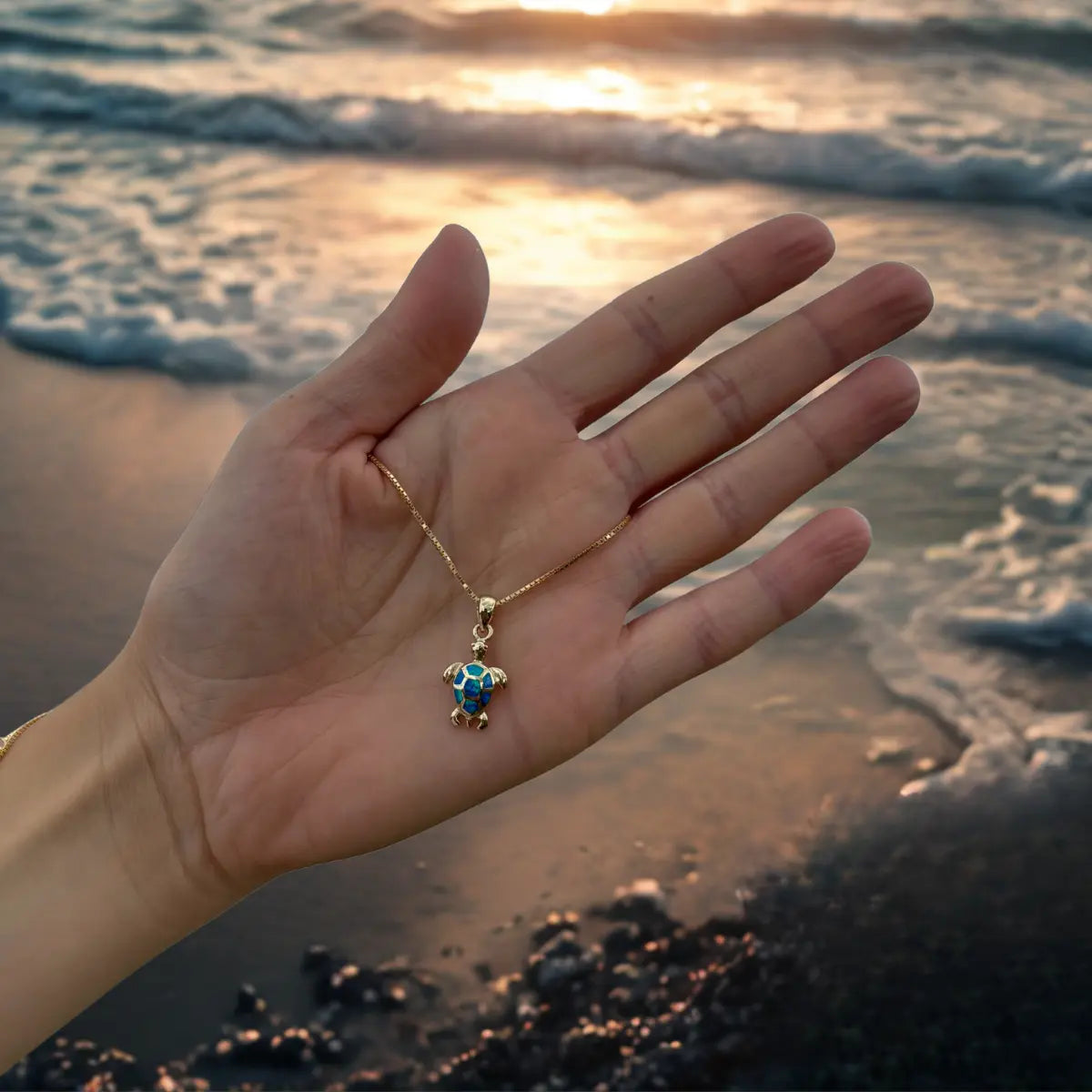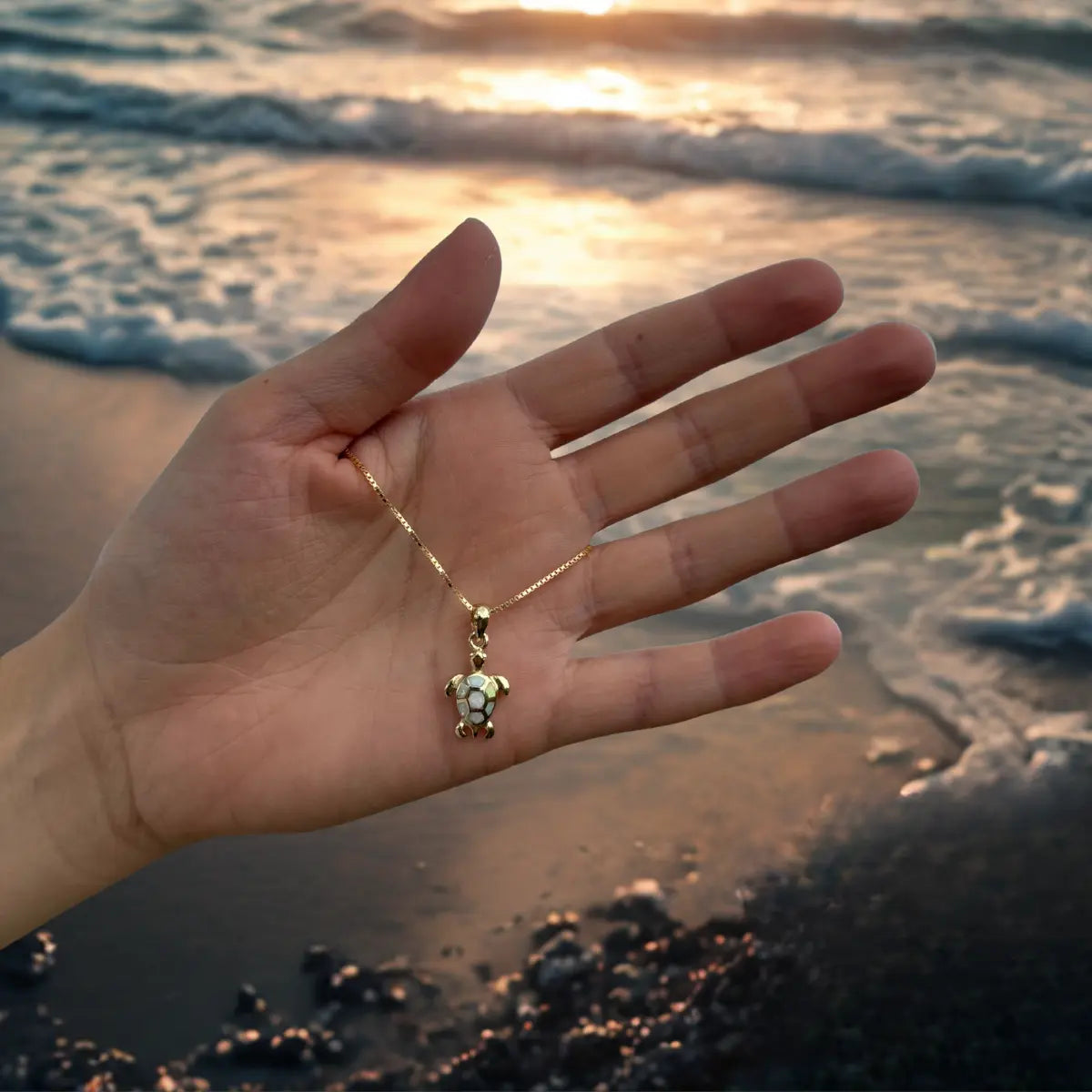 Alava, notre pendentif tortue en argent 925 plaqué or 18k, inspiré des plages de sable noir de Martinique, incarne la force de la nature volcanique et la magie des fonds marins.